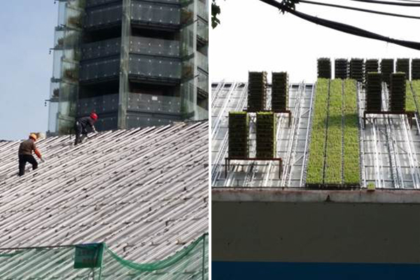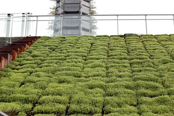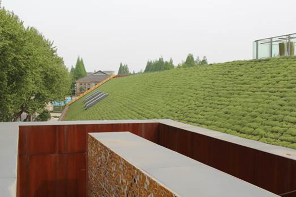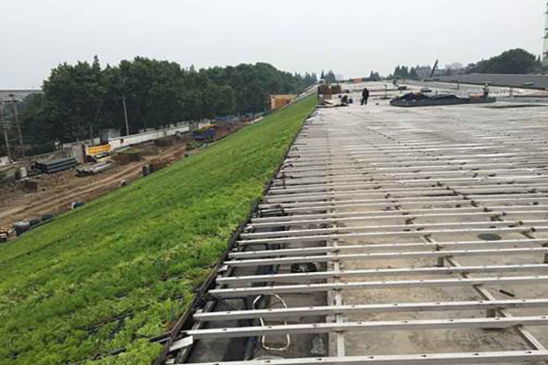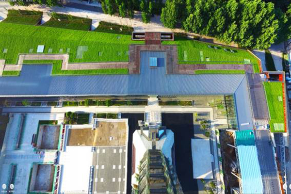 本项目原屋顶设计荷载不足,且屋顶坡度较大,传统屋顶绿化构建方式无法满足项目需求。项目采用斜坡屋面屋顶绿化技术,总绿化面积近10000m2,