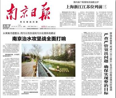 《南京日报》在3月28日的头版对我市黑臭河道治理进行了报道,并配有由我公司施工的的清江河治理工程案例和图片。(见下图)。