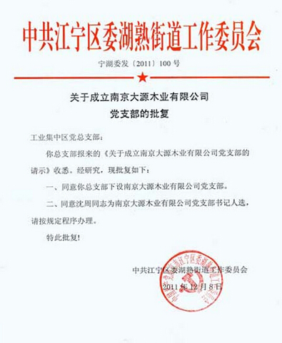 我公司沈周同志被组织部任命为南京大源木业有限公司党支部书记,代表我公司接受了江宁区组织部和湖熟街道工作委员会的授牌,我公司总经理钟培金先生作为新成立党支部的湖熟36家非公企业中的代表,发表了贺言。